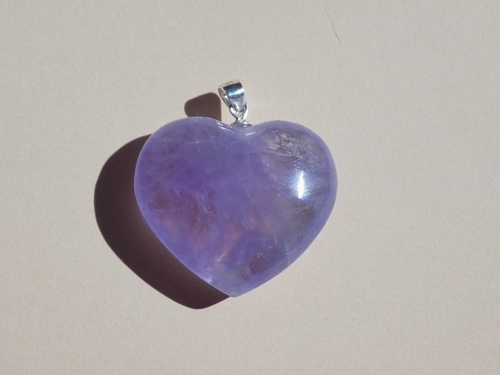 Přívěsek z ametystu ve tvaru srdce se stříbrným zapínáním.