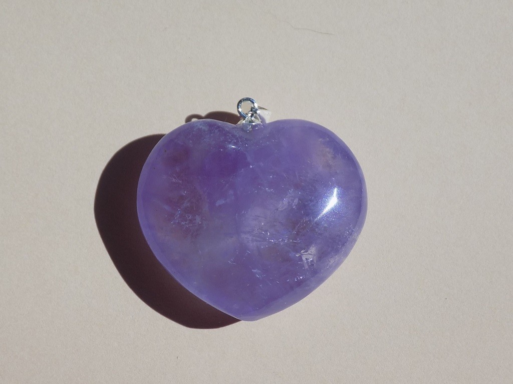 Přívěsek z ametystu ve tvaru srdce se stříbrným zapínáním.