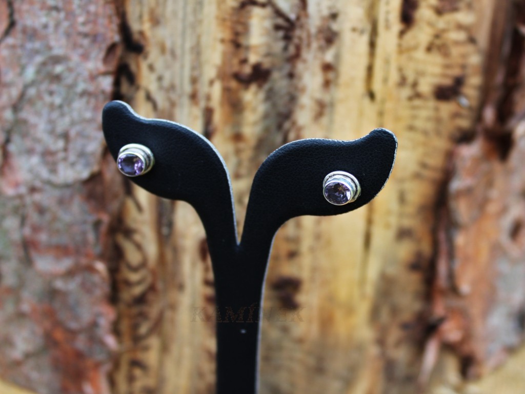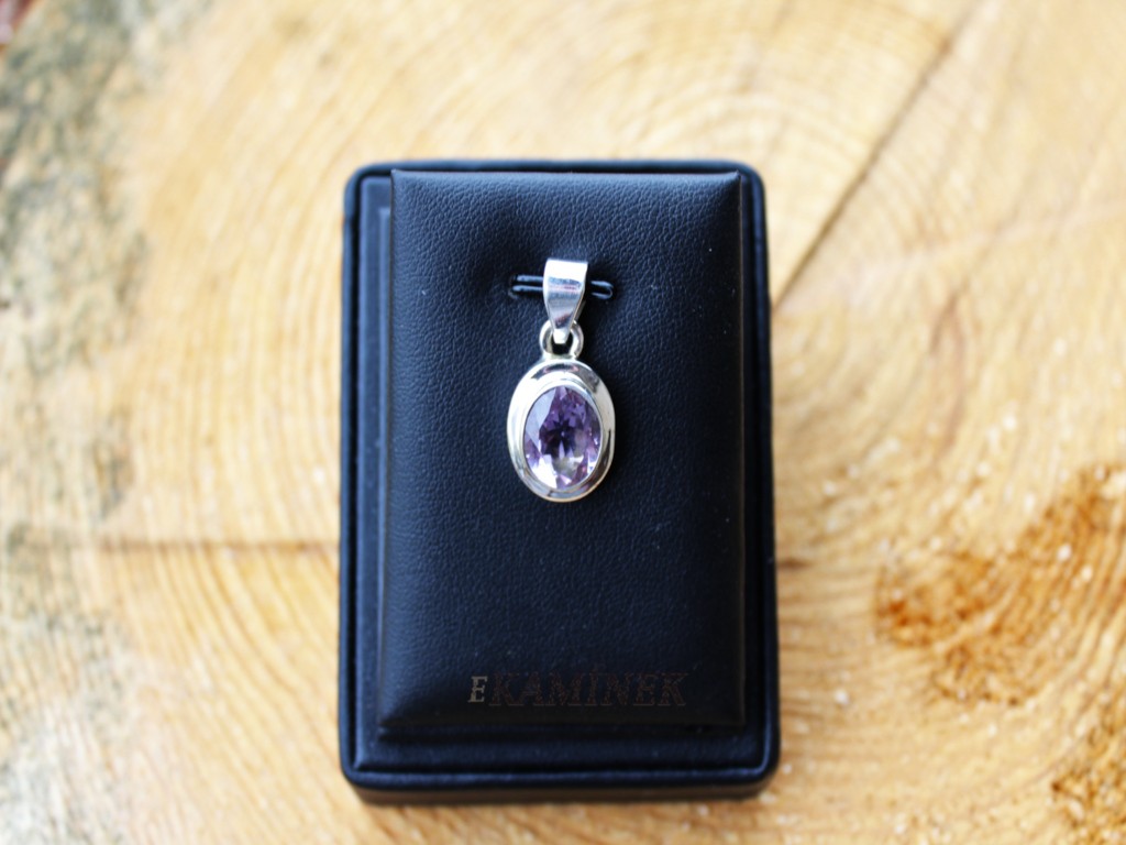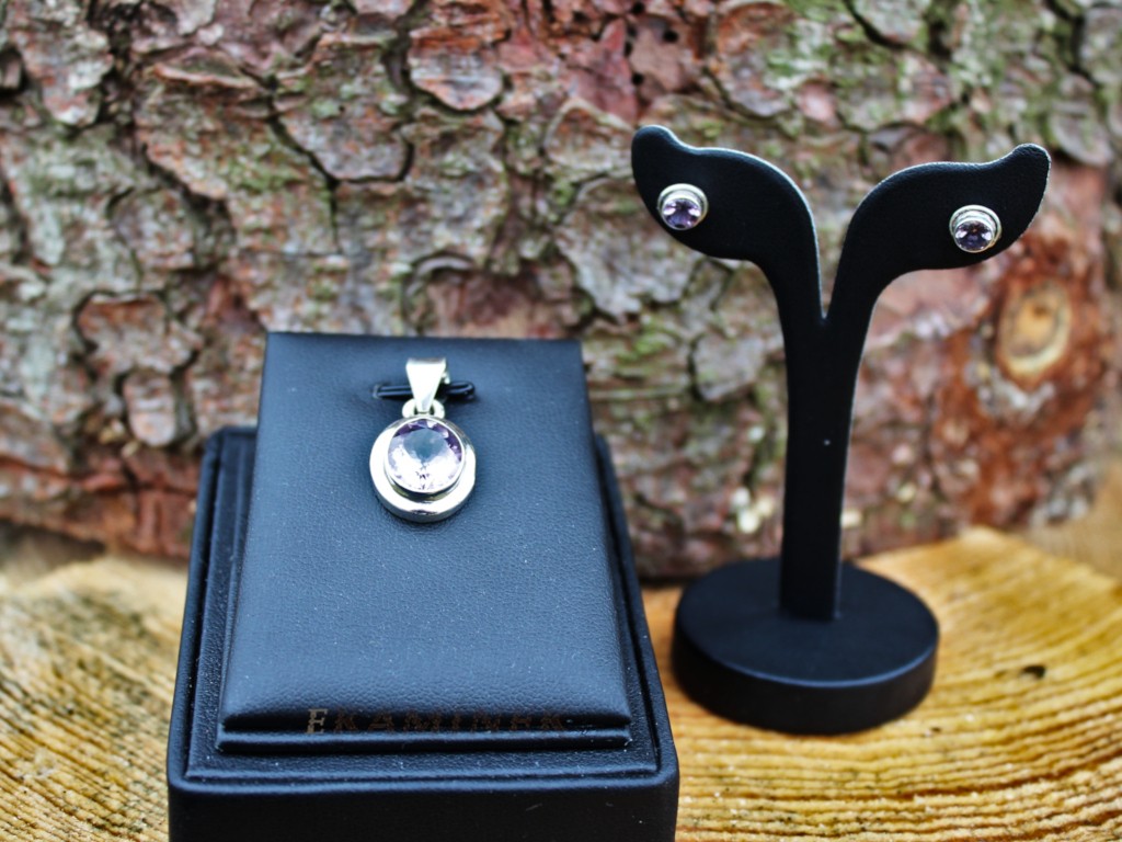 Sada přívěšku s náušnicemi s ametystem. Náušnice mají průměr +-5 mm a mají stříbrné puzetové zapínání, ametyst je zasazen do stříbrného rámečku. Přívěšek má tvar oválku s ametystem zasazeným do stříbrného rámečku o celkové délce +-2,6 cm.