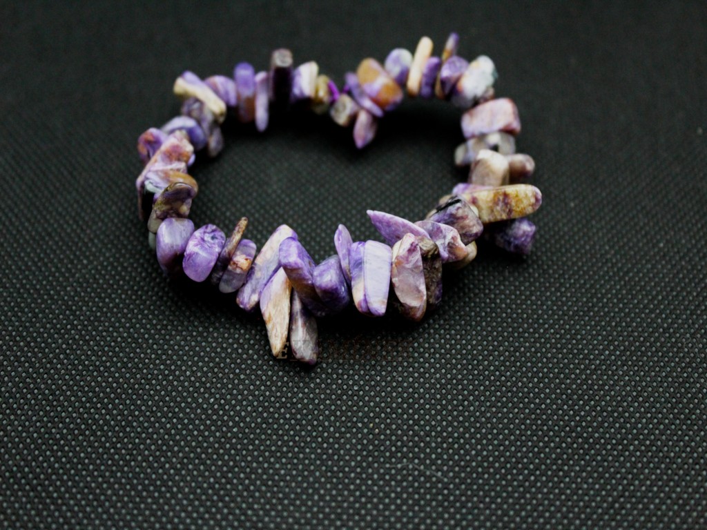 Náramek z čaroitu navlékaný na gumičce (bez zapínání) o délce +- 20 cm. Čaroit nalezneme na jediném místě na světe, a to na Sibiři. Nedaleko místa naleziště protéká řeka Čara, odtud získal tento kámen svůj název.