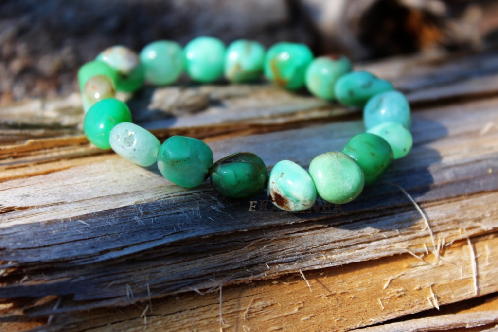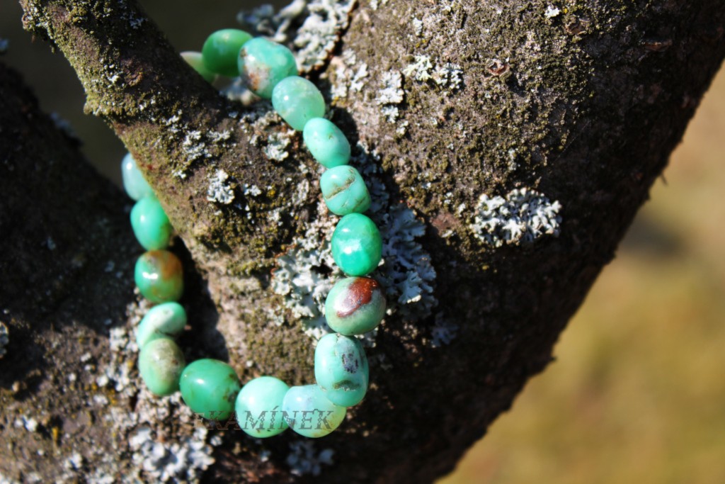 Náramek z chryzoprasu navlékaný na gumičce bez zapínání. Délka náramku +- 19 cm.