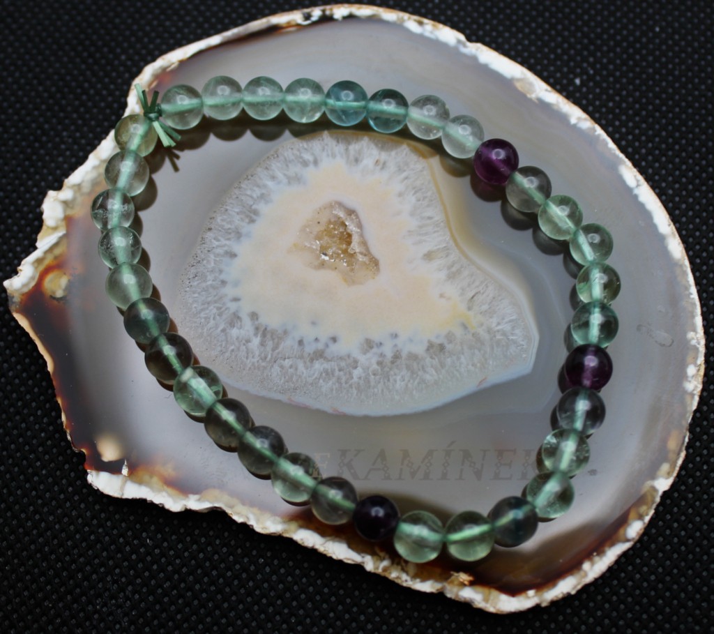 Náramek z kuliček fluoritu navlékaný na gumičce bez zapínání. Délka náramku je cca 19 cm. Průměr kamenů je 6 mm.