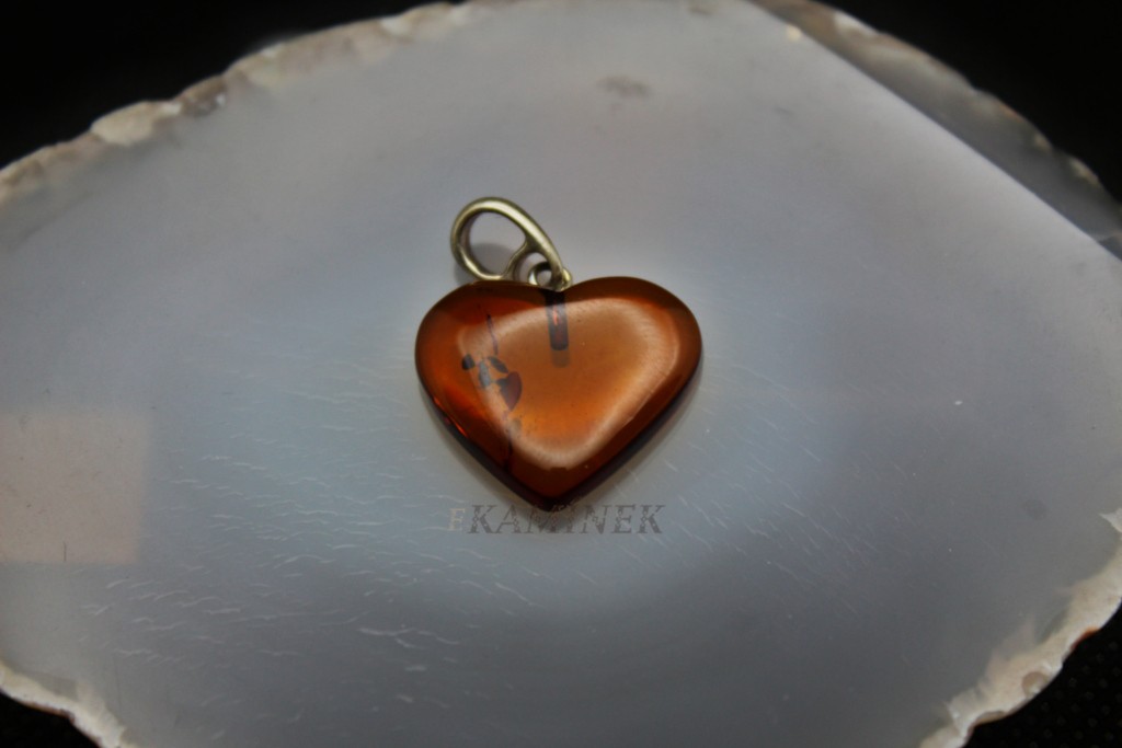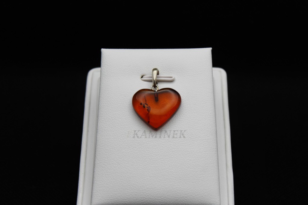Přívěšek ve tvaru srdce z jantaru. Jantar není typický tvrdý kámen ale jedná se o zkamenělou pryskyřici z pravěkých borovic, která může být v některých případech až 100 milionů let stará.