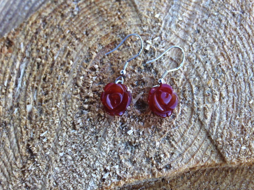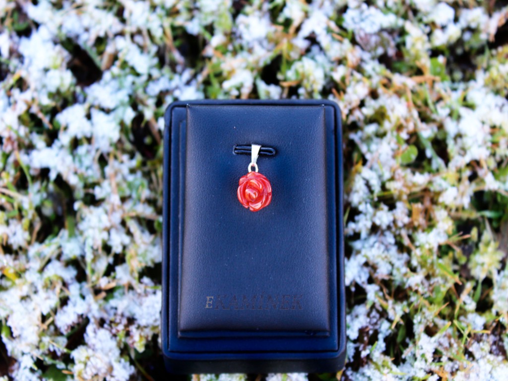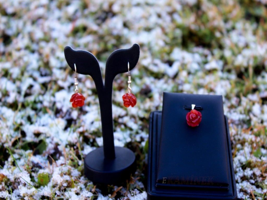 Sada náušnic a přívěšku z karneolu ve tvaru růže. Nežný šperk. Velikost přívěšku je 11x18 mm a náušnic 11x30 mm.