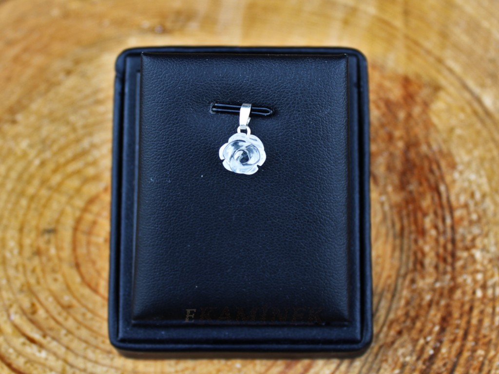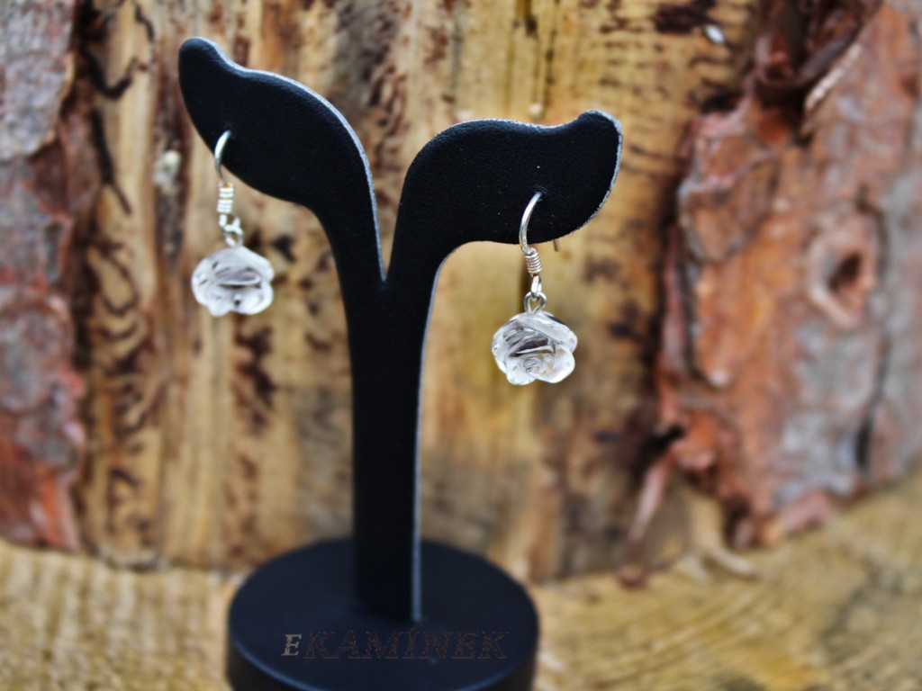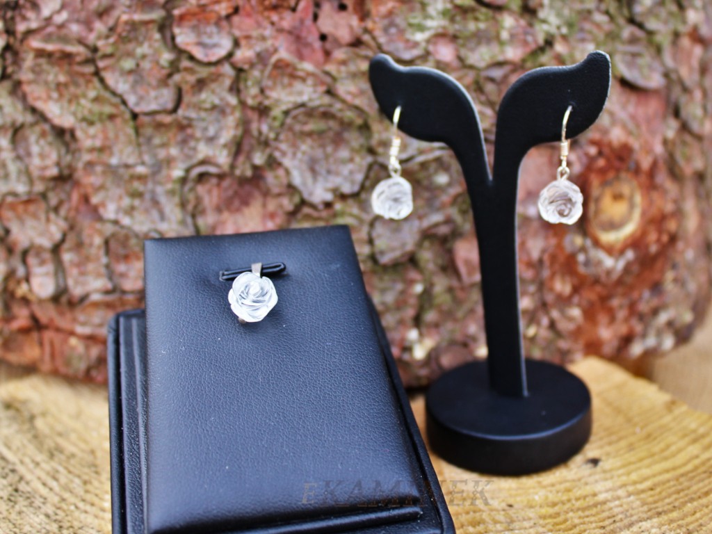 Sada přívěšku s náušnicemi s kameny křišťálu ve tvaru růže. Náušnice se mají průměr +- 8 mm a stříbrný afro háček. Přívěšek má celkovou délku 1,4 cm.