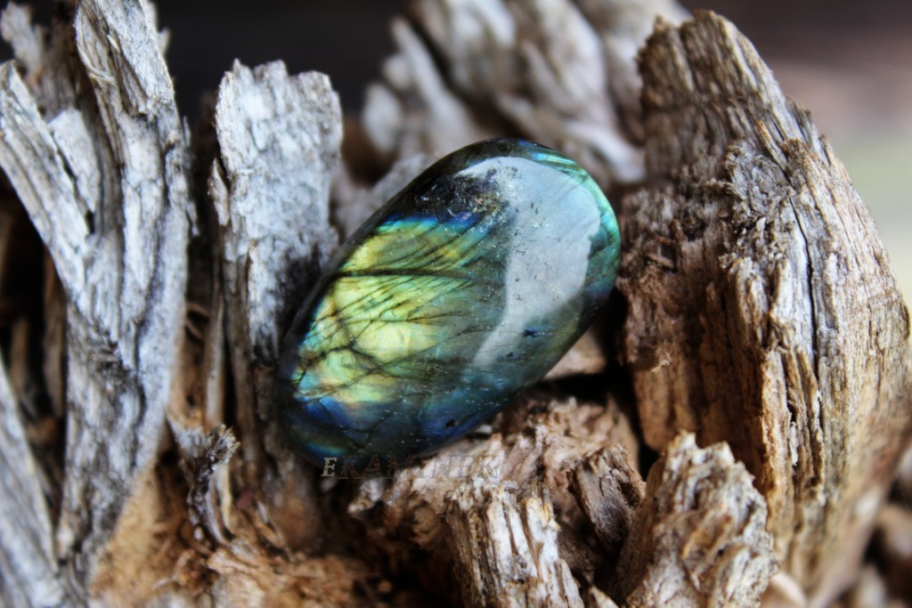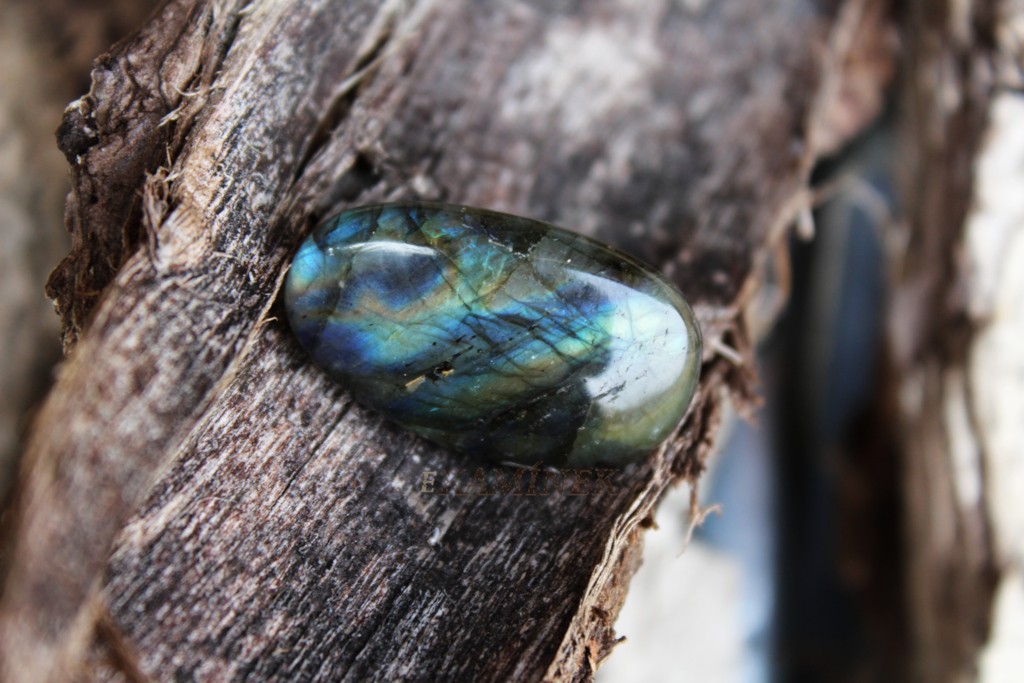 Broušený oválek z labradoritu z Madagaskaru.