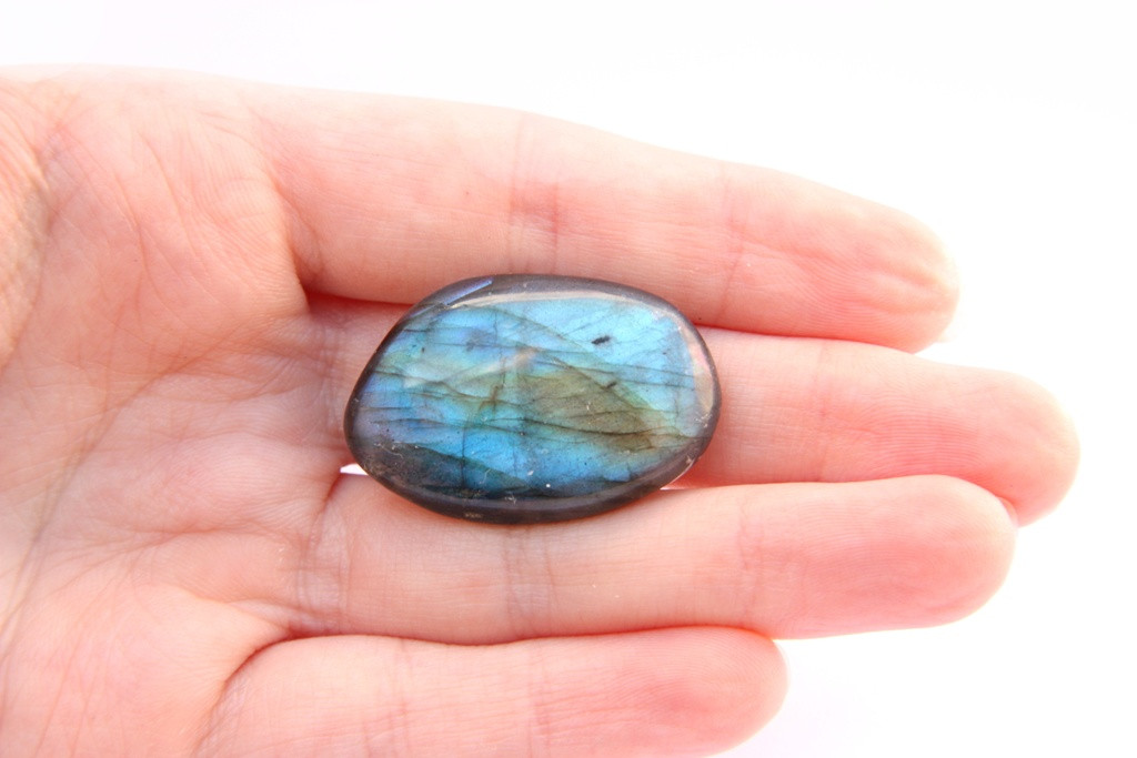 Broušený oválek z labradorit z Madagaskaru.