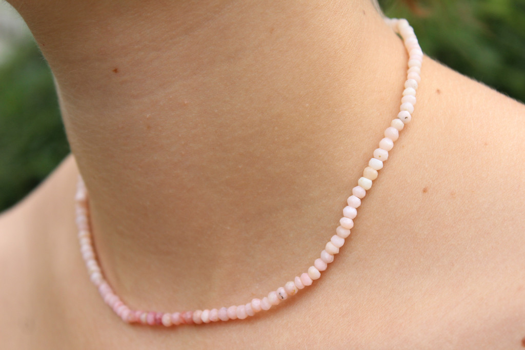 Opál růžový broušený do tvaru facetovaných rondelků o velikosti cca 4x3mm. Délka korálků včetně stříbrného zapínání je cca 41cm.