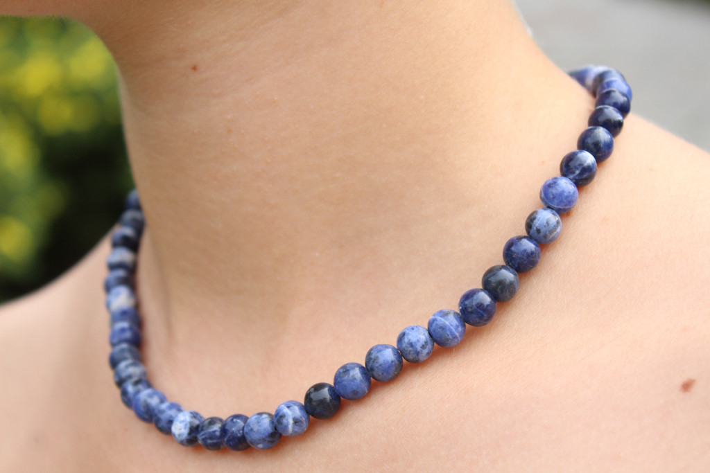 Sodalit broušený do tvaru kuliček o velikosti cca 8mm. Celková délka korálků včetně stříbrného zapínání je přibližně 45cm.