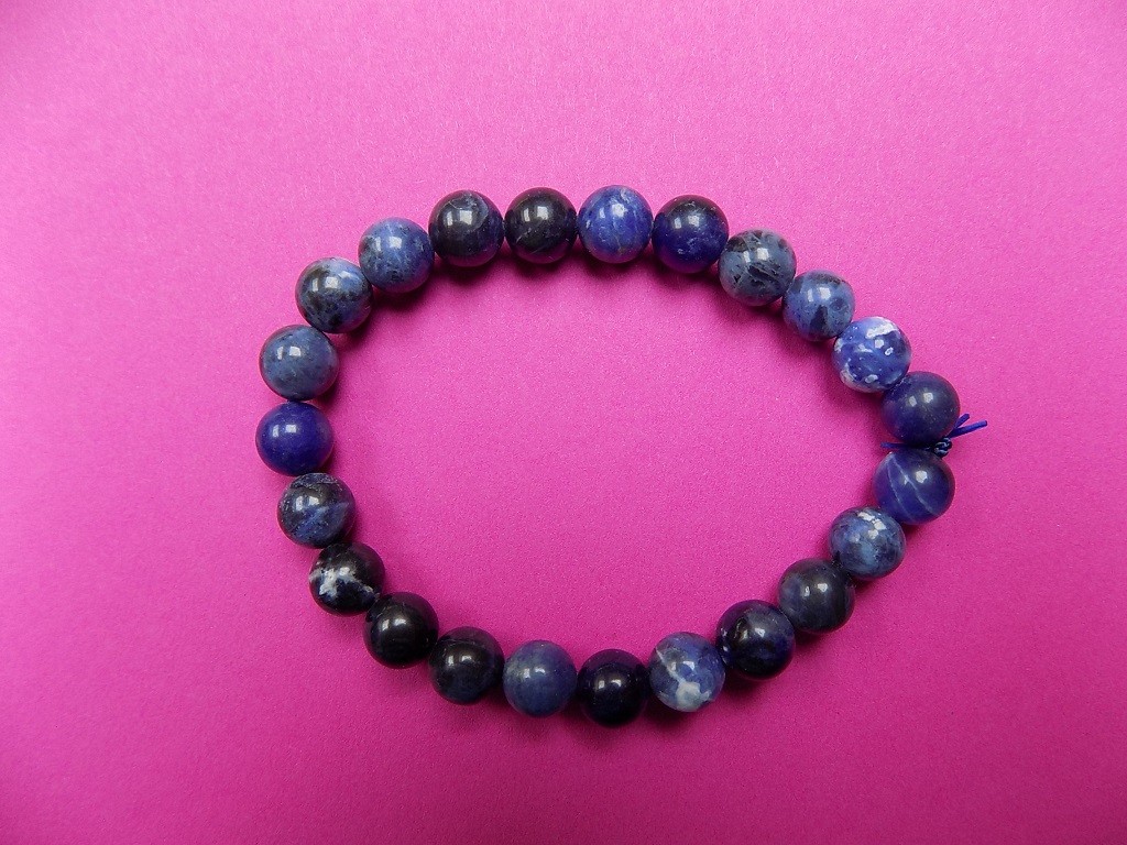 Náramek ze sodalitu navlečený na barevných gumičkách.