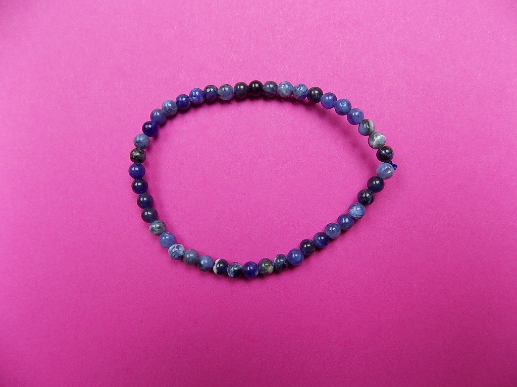 Náramek ze sodalitu navlečený na barevných gumičkách.